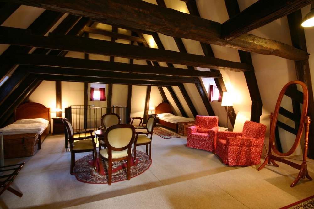 - Pokoje typu Attic / Apartment jsou čtyř až šesti lůžkové s možností přistýlky, o minimální rozloze 50 m2, s původním malovaným nebo podkrovním dřevěným stropem.